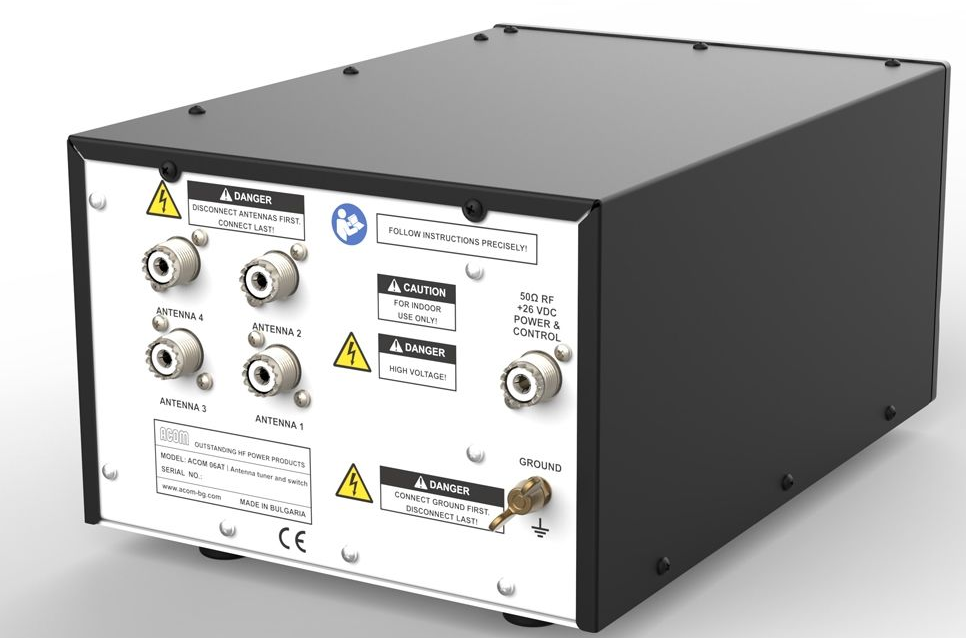 Am Tuner können maximal vier Antennen angeschlossen werden. Die Auswahl der jeweiligen Antenne erfolgt entweder manuell über die Steuerung an der PA oder automatisch anhand der Frequenz. Alle Eingänge sind statisch gegen Aufladung und Blitzschlag in der Nähe doppelt abgesichert. Die Antennenanschlüsse können auch auf "Bypass" geschaltet werden um eine Antenne direkt, ohne Tuner, verwenden zu können. Der Abstimmvorgang des ACOM 06AT Tuners erfolgt automatisch und für den Anwender transparent. Das dauert maximal 5 Sekunden und in der Regel nicht länger als 2-3 Sekunden. Einmal gefundene Abstimm-Einstellungen werden dauerhaft gespeichert, bei gespeicherten Antennen/Frequenz Kombinationen erfolgt der Abstimmvorgang in weniger als einer halben Sekunde. Die so gespeicherten Einstellungen lassen sich auch auf einen Computer exportieren und später wieder zurück spielen. Es stehen bis zu 1000 Speicherpositionen zur Verfügung. Falls die PA und der Transceiver per CAT-Schnittstelle verbunden sind (und die PA so die Betriebsfrequenz immer verfolgen kann) folgt der Tuner der eingestellten Frequenz und wählt Anpassung und Antennenanschluß auch aus, ohne das gesendet werden muss. Diese CAT Verbindung ist optional, sie wird für vollautomatischen Betrieb nicht benötigt.