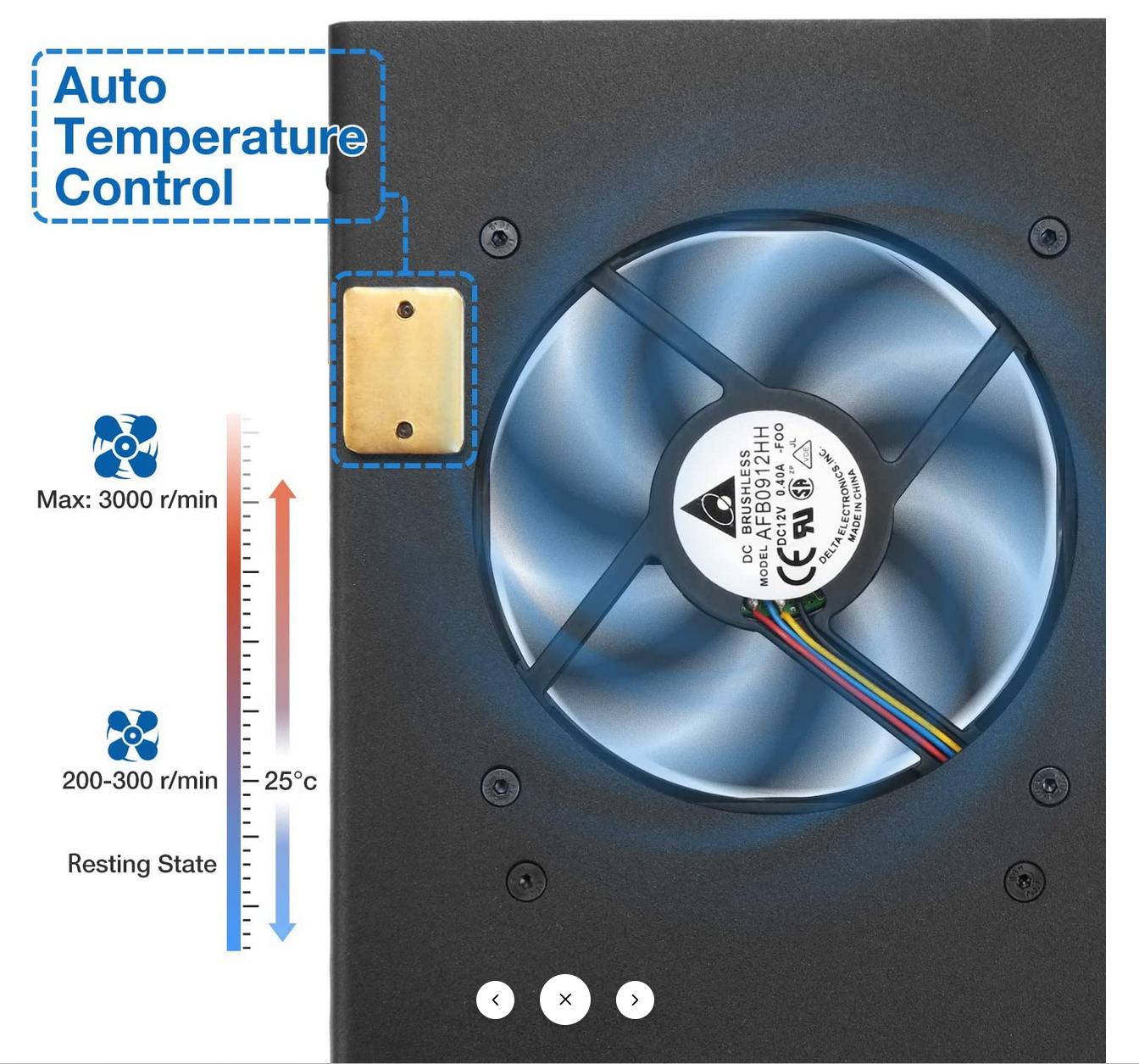 - Wenn der Sensor feststellt, dass die Gehäusetemperatur über 60 C liegt, erhöht der Lüfter automatisch die Drehzahl, und somit das Luftzufuhrvolumen welches den Kühlprozess beschleunigt.